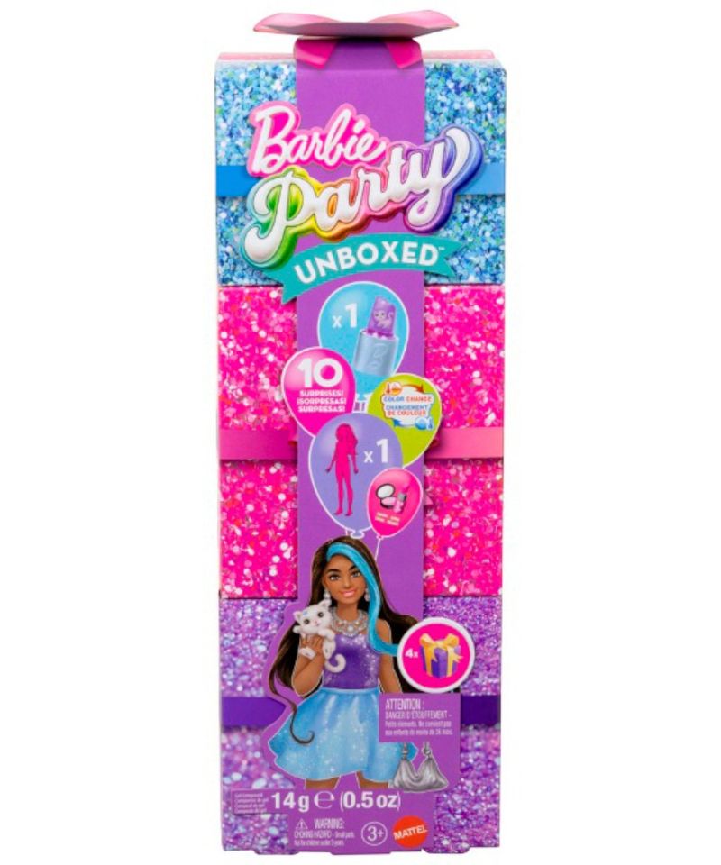 Las muñecas Barbie Party Unboxed Pet Birthday Series llegan llenas de diversión y sorpresas para celebrar cumpleaños inolvidables. Cada set incluye una muñeca Barbie con accesorios temáticos y una adorable mascota para acompañar la fiesta. Entre las opciones disponibles están los sets Party Stars, Shimmerin’ Hearts y Birthday Bows, cada uno con 10 sorpresas que incluyen ropa, accesorios y detalles festivos únicos para crear historias y momentos especiales. Perfectas para niños y niñas que aman la moda, las mascotas y la diversión en cada celebración. Cada muñeca se vende por separado y está sujeta a disponibilidad. Colores y detalles pueden variar.