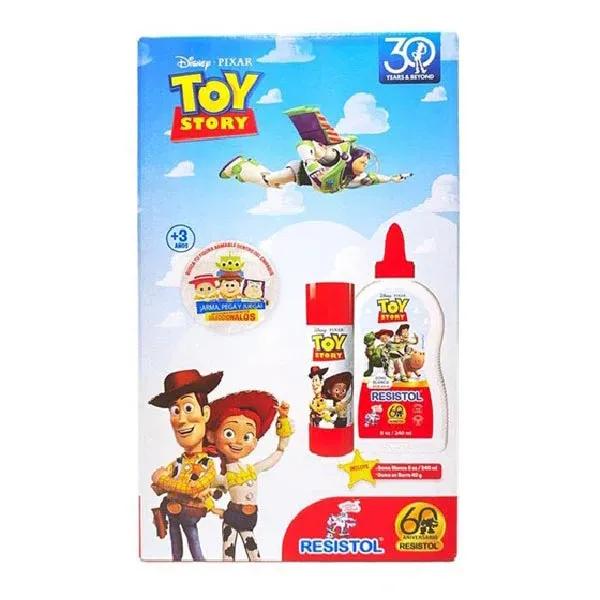 Pegamento escolar Resistol con diseño de Toy Story, ideal para uso en manualidades, tareas y actividades creativas en el hogar o la escuela. Incluye dos presentaciones de pegamento, una en barra y otra líquida, que permiten adaptarse a diferentes necesidades de pegado en papel, cartulina y materiales ligeros. Su fórmula está pensada para un uso práctico y seguro, facilitando una aplicación uniforme y controlada. La presentación con diseño llamativo resulta atractiva para niños, convirtiéndolo en un complemento funcional y visualmente agradable para proyectos escolares.