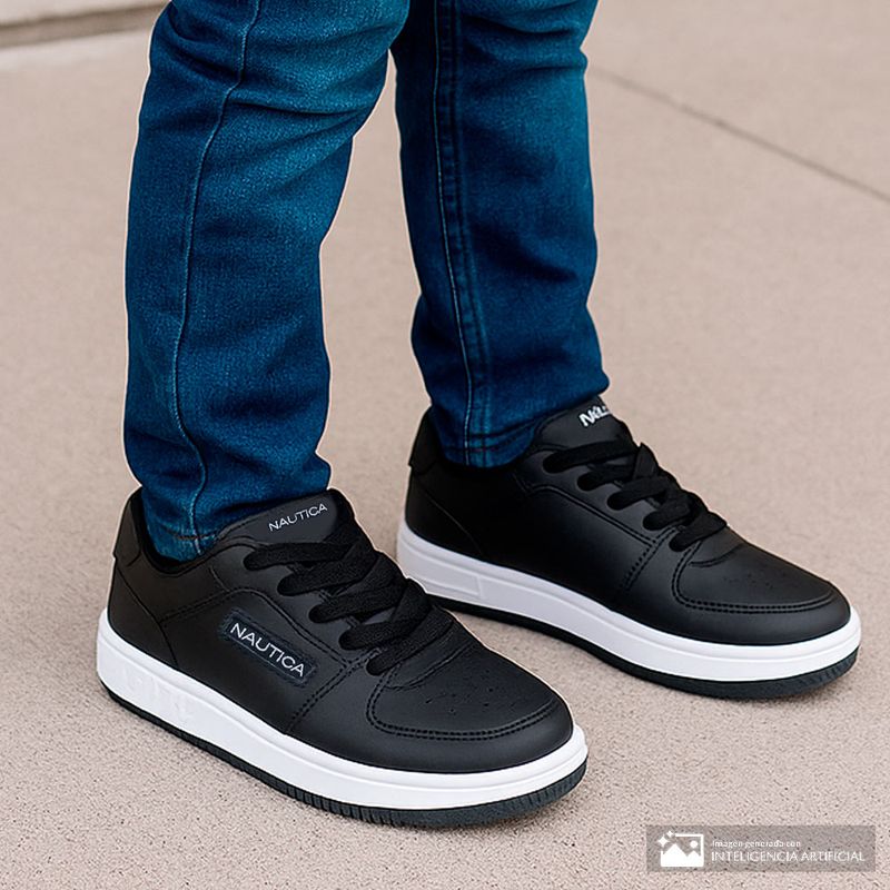 Combina estilo y comodidad con estos zapatos casuales de Nautica en negro con detalles en gris y rojo. Su diseño versátil incluye detalle de la marca en el lateral, cierre de cordones, puntera redonda y acabado tipo cuero, ofreciendo un estilo moderno y sofisticado. La parte frontal microperforada garantiza transpirabilidad y confort durante todo el día.